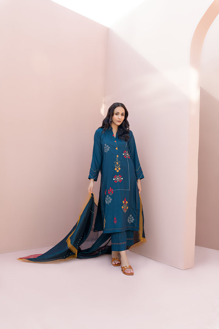 Teal and fresh, this embroidered 3-piece set is breezy, modern, and totally re-wearable. Pair with hoops and nude heels for max impact.