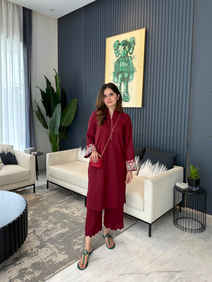 Want to look bold but also easy-breezy? The Wine outfit, with its lovely wine red shade, nails the fashion trend 2025. The embroidery on the sleeves gives you that dash of elegance without trying too hard.
