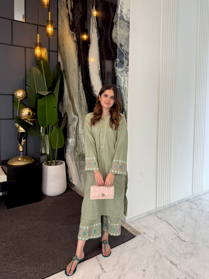 Looking for something ultra-fresh and fun? The Melon Cooler outfit from the new lawn collection is perfect for you. With a greyish green tone and cool embroidery on the sleeves and bottoms, you'll feel like a tropical breeze all day long.
