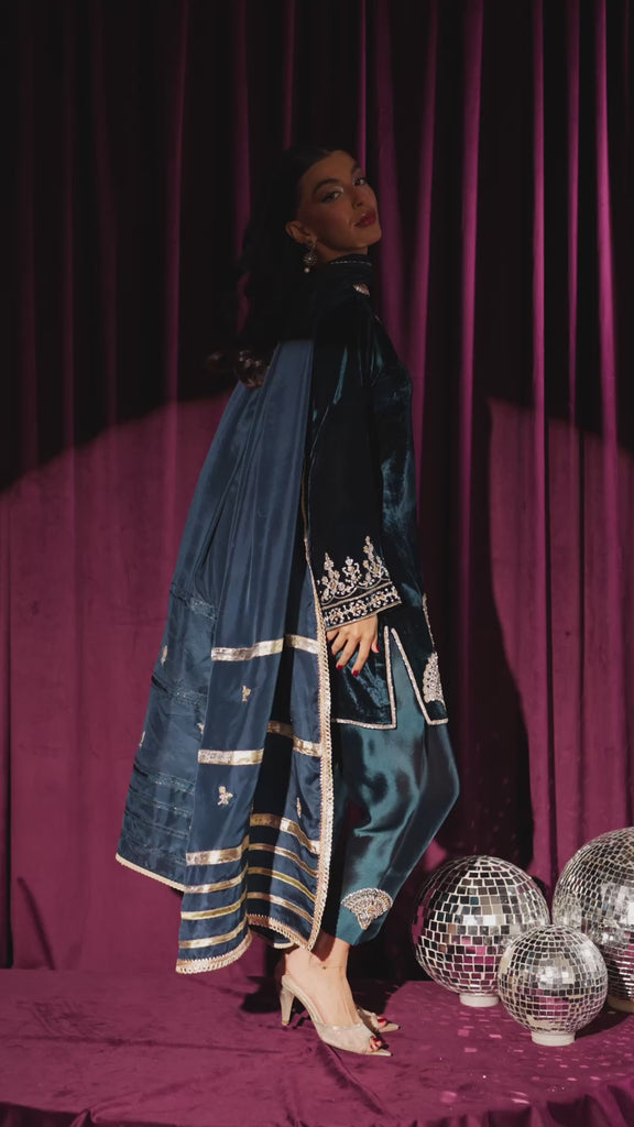 Experience the allure of Blue Bird from our Velvet Luxe MARA collection, a sophisticated three-piece set featuring a teal blue toned short pure velvet shirt, paired with sheesha silk skinny shalwar and a pure medium silk dupatta.