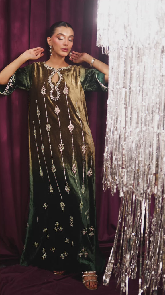 From our Velvet Luxe MARA collection, Golden Hour is a long Jalabiya-style kaftan in elegant ombre shades of olive and green. The set features a pure velvet kaftan paired with pure sheesha silk pants and a separate pure medium silk dupatta. The kaftan features half sleeves with intricate detailing and is lavishly embellished with Swarovski stones from top to bottom, including full embellishment on the neckline and back for a luxurious, statement-making look.