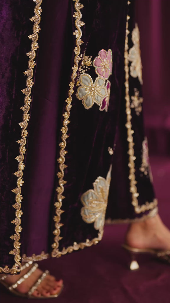 Step into refined elegance with Petal from our Velvet Luxe MARA collection, a plum-toned long shirt paired with pure sheesha silk izaars. Crafted from pure velvet, the shirt is lavishly embellished with dabka, kora, resham, and appliqué work in delicate shades of ice blue, plum, and lavender, forming exquisite floral and petal motifs. The design is tailored in a long coat-style silhouette, making it a graceful choice for the breezy season. The ensemble is completed with a plum-toned dupatta in pure medium silk, adorned with intricate all-over embroidery for a refined finish.