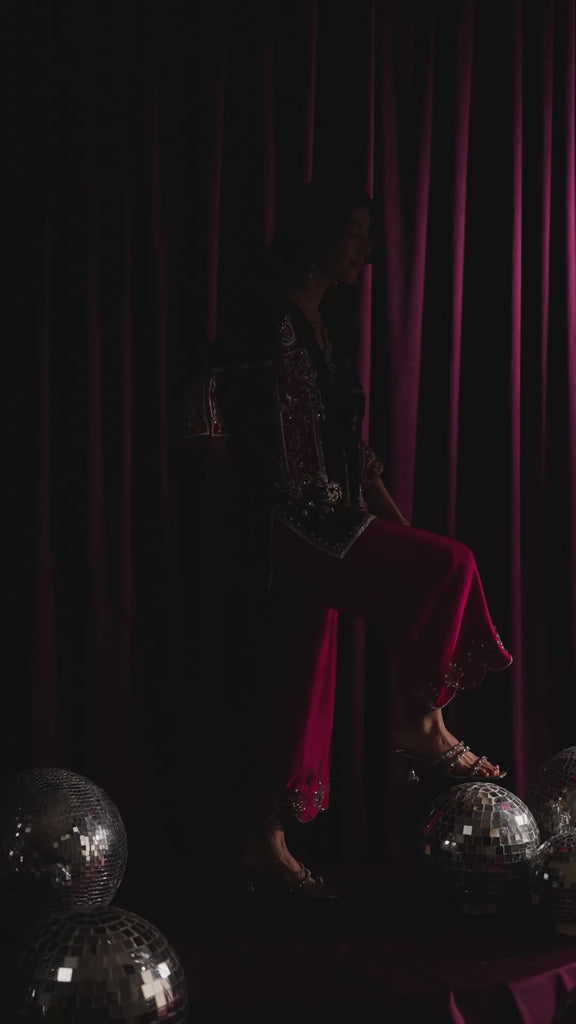 Step into effortless elegance with Zucchini from our Velvet Luxe MARA collection. This olive-toned, short cape-style shirt is paired with pure sheesha silk izaars, creating a chic and contemporary silhouette. Crafted from pure velvet, the shirt is richly adorned with dabka, kora, resham, and appliqué work in delicate shades of pink, featuring striking fuchsia appliqués with intricate golden detailing.