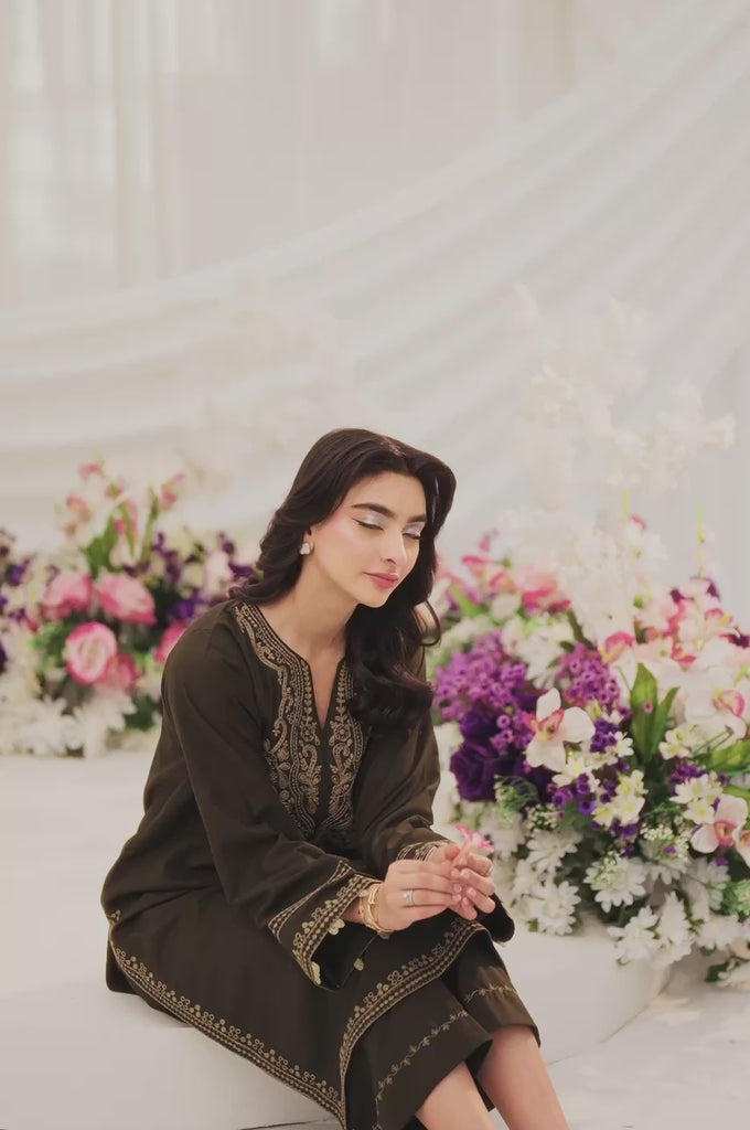Dark brown coloured embroidered aari work set that comes with long shirt and culottes. Fabric used is premium blended viscose suitable for all seasons. Dupatta is brought separately and is curated from silk.