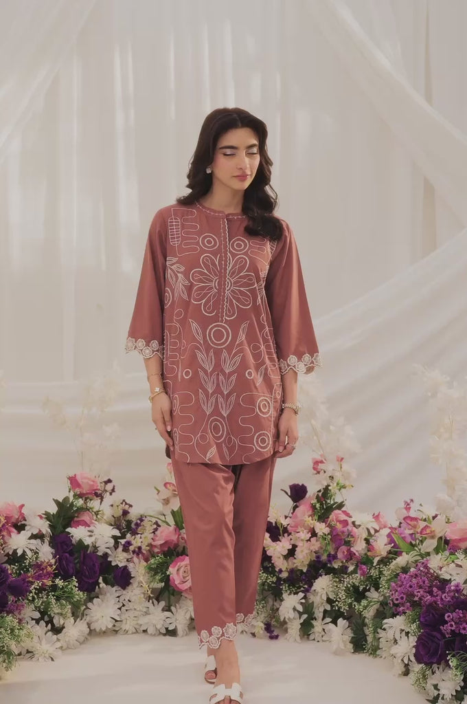 Rose coloured embroidered set that comes with short shirt and skinny shalwar. Fabric used is premium blended viscose suitable for all seasons. Dupatta is brought separately and is curated from chiffon.
