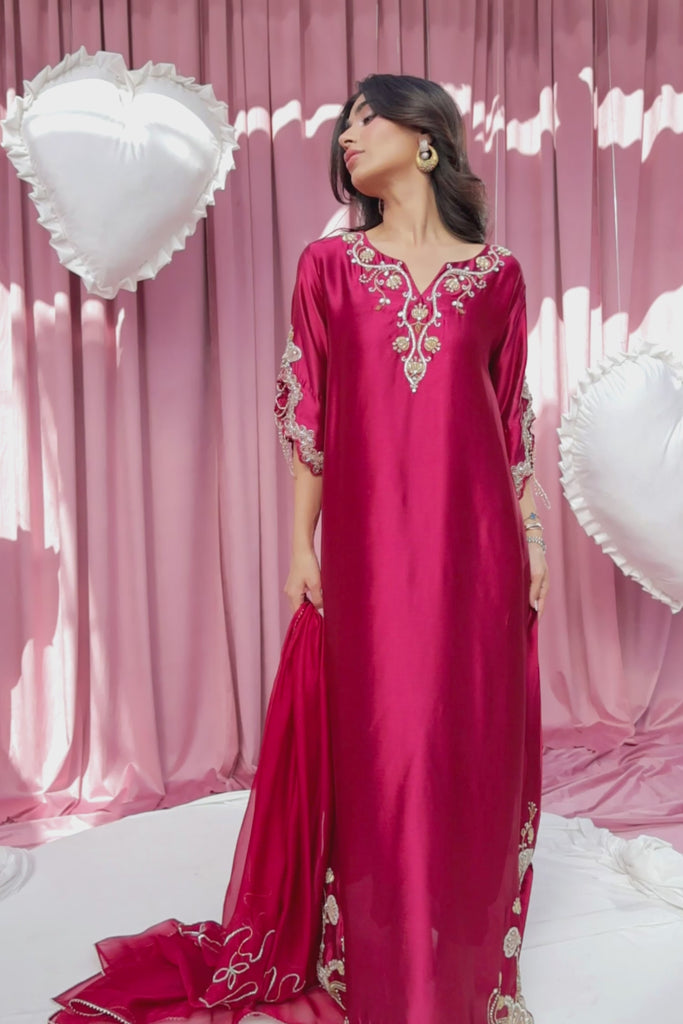 Cranberry-toned long kaftan set crafted in pure Sheesha silk, paired with matching pants. The kaftan features intricate golden dabka and kora work on the daman, sleeves, and hemline, with delicate golden hangings on the sleeves for added elegance.