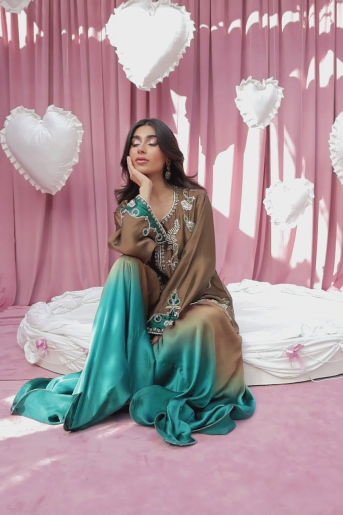 A short dusty olive jacket, exquisitely tailored in pure sheesha silk, is paired with fluid ombré charmeuse silk pants in deep hues of maple and emerald green. The ensemble is adorned with intricate dabka, kora, and resham embroidery forming elegant peacock motifs. A medium silk dupatta completes the look and is paired separately. -Inner is included and comes unattached.