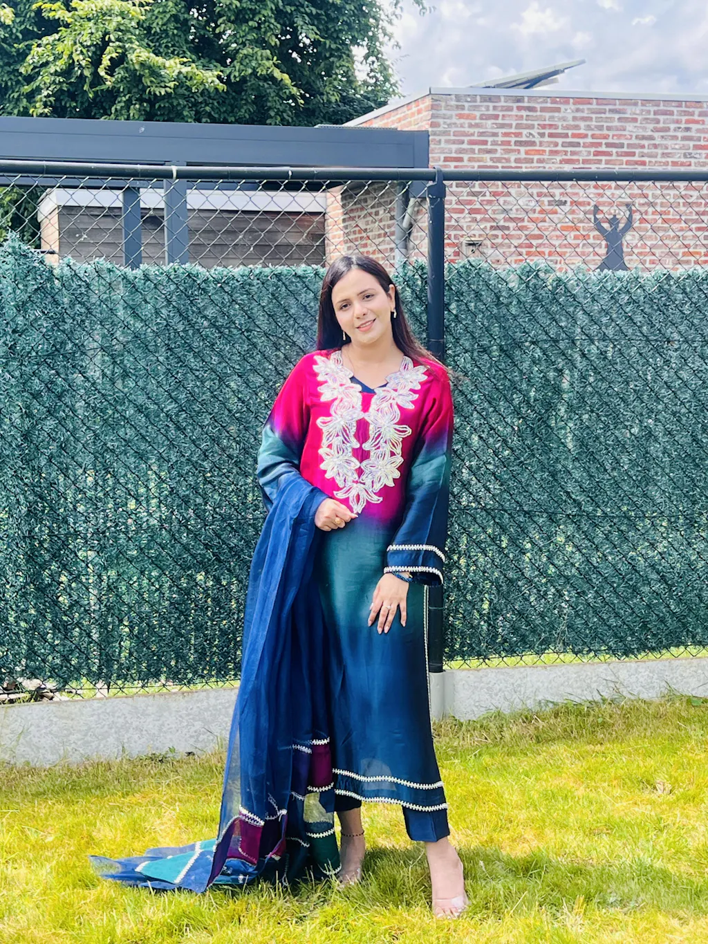 Elevate your style with our captivating Three-Toned Ensemble, seamlessly blending the rich hues of plum purple, peacock green, and royal blue for a harmonious and luxurious appeal. Crafted from premium-quality pure sheesha silk fabric, both the shirt and pants exude elegance and refinement. The meticulous blending of the three shades creates a smooth and sophisticated finish, while the pure sheesha organza dupatta mirrors this captivating color palette for a cohesive look. Adorned with exquisite Swarovski flower work, the neckline adds a touch of opulence and glamour to the ensemble, ensuring you stand out with effortless grace and charm.