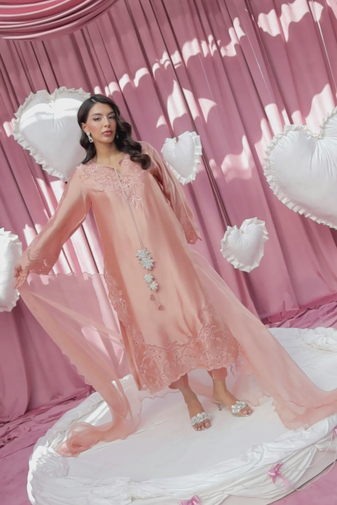 Peach-toned long shirt and pants set crafted in pure Sheesha silk, featuring delicate machine and cutwork embroidery with handmade Swarovski tassels on the neckline. Comes with a pure kittan organza dupatta adorned with matching embroidery.