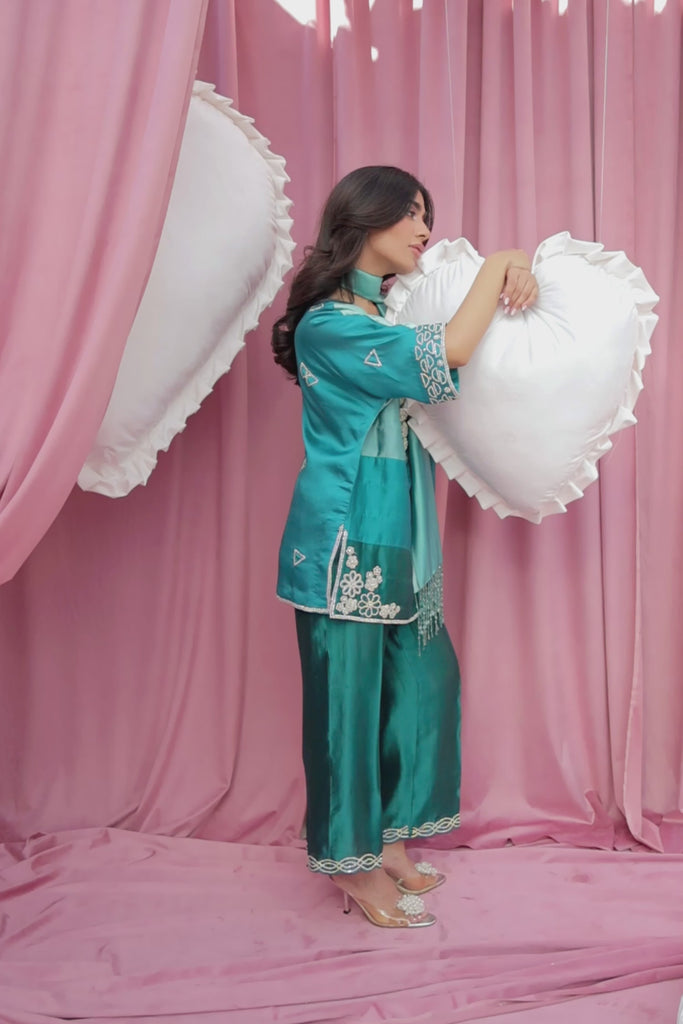 An Ocean & Turquoise Ombre Ensemble crafted in pure Sheesha silk, featuring horizontal color-gradient appliqués. The hand-embellished izaars and 3D Swarovski flowers on the neckline add a luxurious touch, while the matching Sheesha silk stole with hanging crystals completes the look.